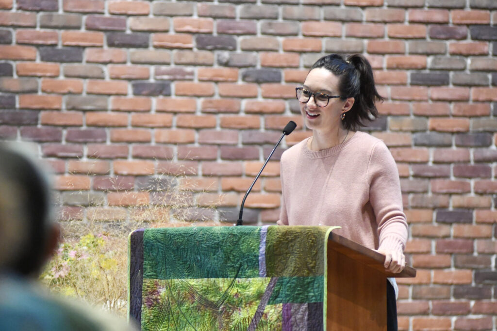 She also explained how people are bound up in community with both their ancestors and those who will come after them. The actions of their ancestors have led them to where they are now, and the actions that they take in turn affect the generations that come after them. She closed by sharing a phrase that is important to her and that she often repeats: “I am a human being; I am always arriving.”